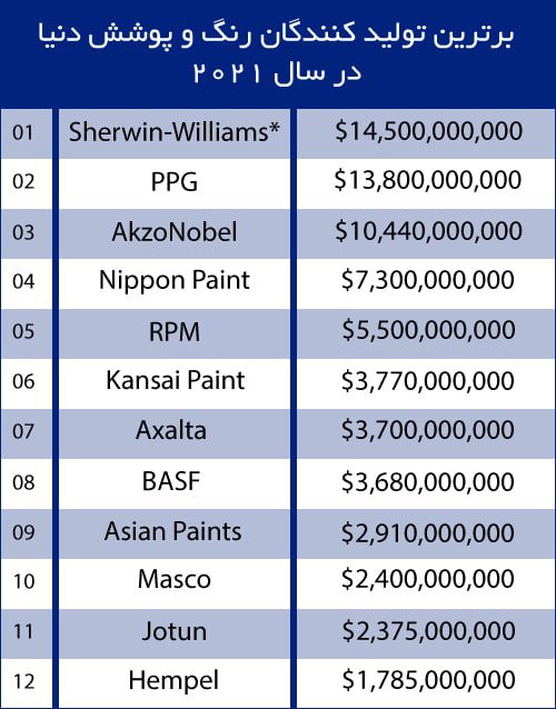 لیست برترين تولید کنندگان رنگ و پوشش دنيا در سال 2021 را مجله “كوتينگز ورلد” منتشر كرده است. در اين لیست 81 شرکت معرفی شده اند كه همگی آنها فروش بيش از 100 ميليون دلار در سال داشتهاند.